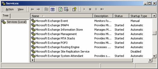 Starea serviciilor de Exchange 2000:'Microsoft Exchange Information Store Service','Microsoft Exchange MTA Stacks','Microsoft Exchange Routing Engine','Microsoft Exchange System Attendant','SMTP','World Wide Web Publishing Service' se poate vizualiza in consola MMC 'Services'.