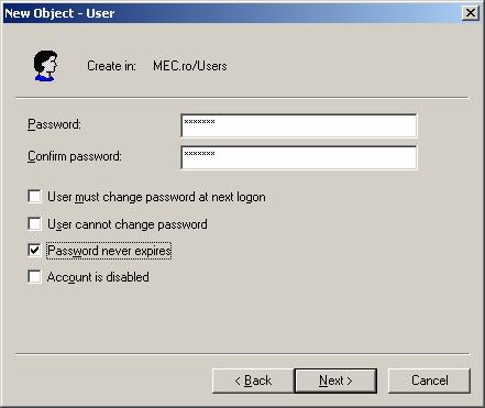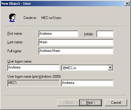 Se deschide fereastra < New Object - User > si se completeaza cimpurile respective cu datele personale ale clientului de e-mail ca in figura de mai jos.