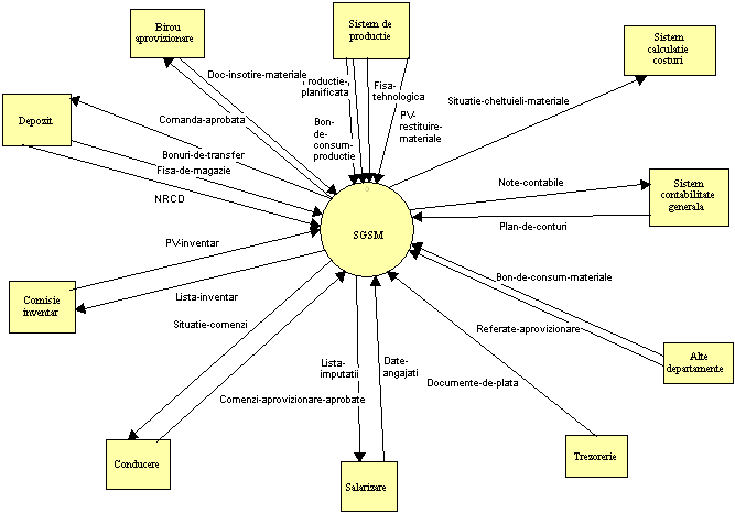 Prima diagrama care se obtine este diagrama de context (Anexa 2), care contine un singur simbol pentru procesul de prelucrare, respectiv sistemul care se modeleaza, precum si sursele/destinatiile principalelor fluxuri de date, fara a se reprezenta locurile de stocare a datelor.