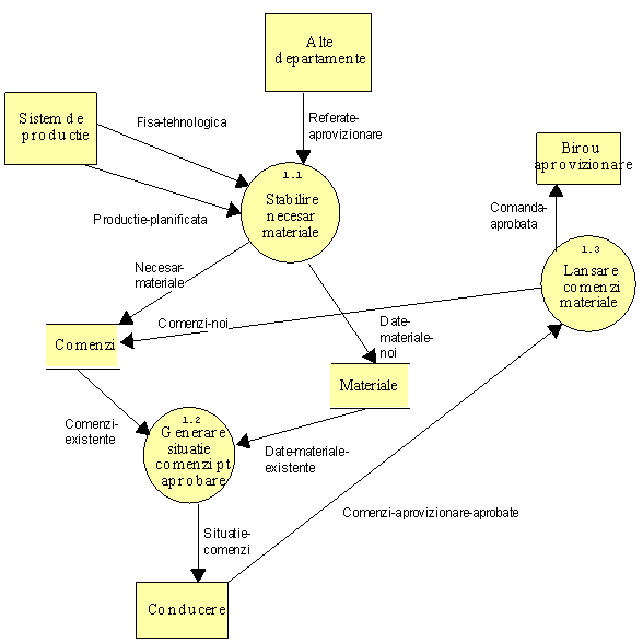 In exemplul luat pentru sistemul de gestiune a stocurilor nu s-a realizat decat descompunerea procesului de Aprovizionare cu materiale din diagrama de nivel 0, prin intermediul diagramei de nivel 1 din Anexa 4 si diagramei de nivel 2 din Anexa 5. Celelalte procese din diagrama de nivel 0 (Evidenta tranzactiilor cu materiale, Actualizarea stocurilor, Inventarierea si Evidenta furnizorilor) trebuie sa fie modelate prin diagrame de nivel 1 si 2 in aceeasi maniera.