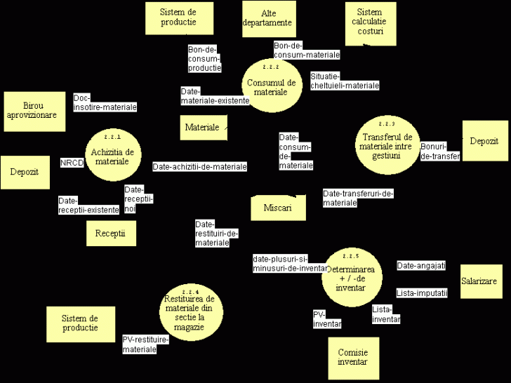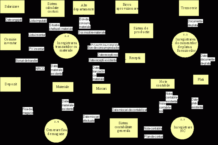 Urmeaza diagrama de nivel 0 (Anexa 3), care prezinta principalele procese de prelucrare ale sistemului. Incepand cu aceasta diagrama apar si locurile de stocare a datelor (tabele ale unei baze de date, baze de date, fisiere, dosare sau cartoteci in care se pastreaza datele).