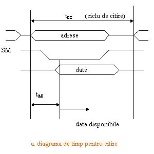 adreselor si momentul in care datele sunt disponibile. Cu tcc s-a notat durata ciclului de citire ca fiind intervalul de timp dintre momentul in care adresele sunt activate pentru citire si momentul de timp la care se poate face o noua activare a adreselor. Cu tcs s-a notat durata ciclului de scriere ca fiind intervalul de timp dintre momentul in care adresele sunt activate pentru scriere si momentul de timp la care se poate face o noua activare a adreselor.