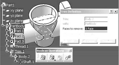 in fereastra de dialog 'Trim Definition', in campul 'Trim:' se selecteaza trunchiul de con (Body.2), iar campul 'With:' contine corpul cu care se realizeaza intersectia (PartBody). in campul 'Faces to remove:' se selecteaza suprafata superioara a corpului ce reprezinta volumul de material ce se doreste a fi inlaturat, iar campul 'Faces to keep:' contine suprafata exterioara a trunchiului de con (figura 3.163).