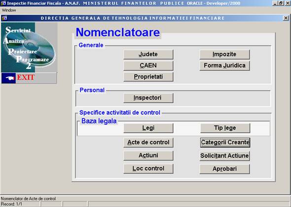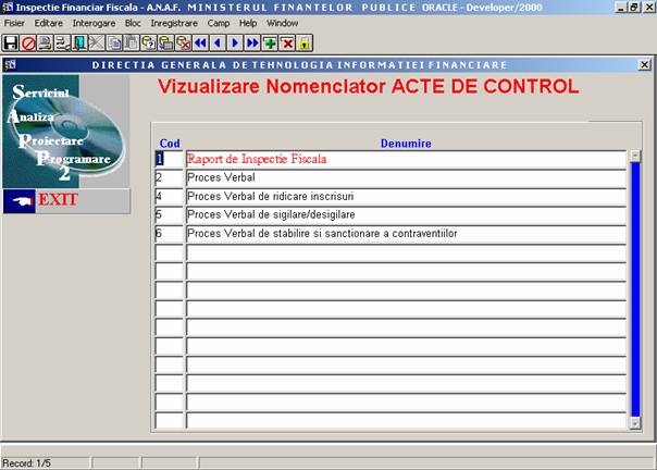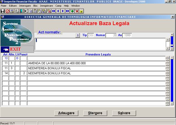 Contine un bloc de date care permite introducerea/actualizarea actelor normative legale utilizate in activitatea de Inspectie Fiscala. Aceste informatii sunt gestionate de catre Utilizatorul de aplicatie de nivel 2. Navigarea in blocul de date se face prin intermediul scrollbar-ului.