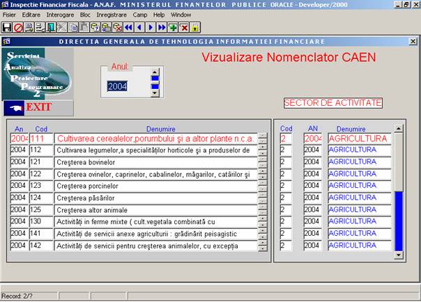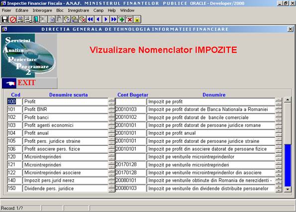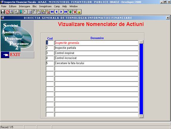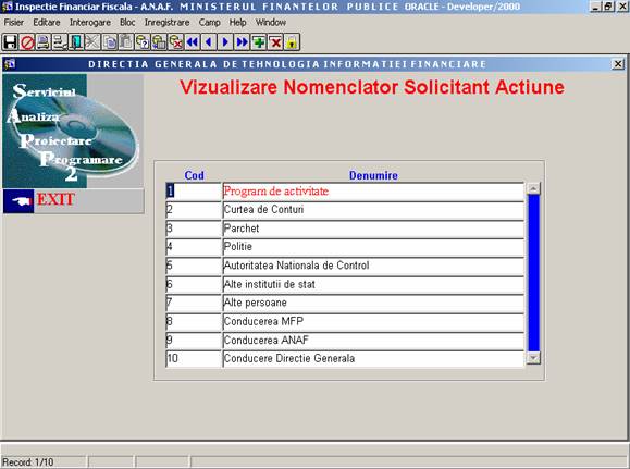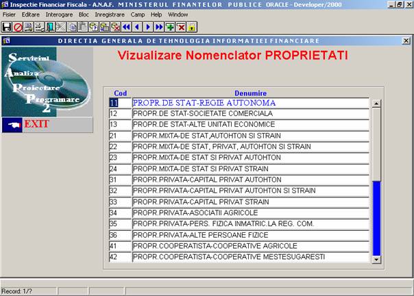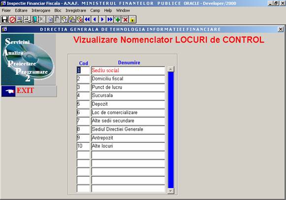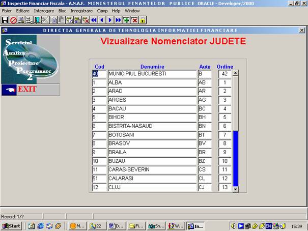 Forma contine un bloc de date care permite vizualizarea datelor. Se afiseaza codul si denumirea judetului, etc. Aceste informatii sunt gestionate la nivel central. Navigarea in blocul de date se face prin intermediul scrollbar-ului.