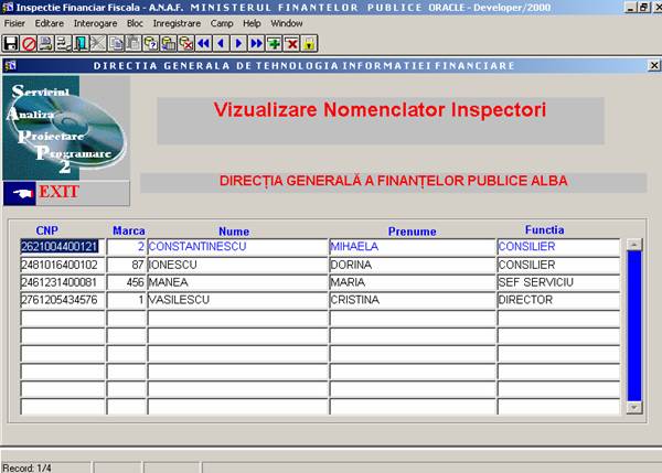 Contine un bloc de date care permite vizualizarea datelor. Aceste informatii sunt gestionate la nivel judetean, prin intermediul aplicatiei PERSONAL-ORACLE . Navigarea in blocul de date se face prin intermediul scrollbar-ului.