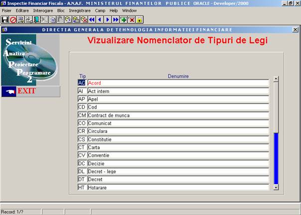 Contine un bloc de date care permite vizualizarea tipurilor de acte normative . Se afiseaza codul si denumirea tipurilor de acte normative. Aceste informatii sunt gestionate la nivel central. Navigarea in blocul de date se face prin intermediul scrollbar-ului.