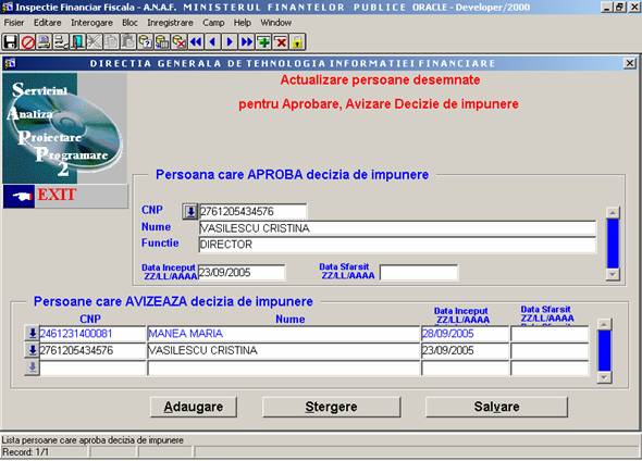 Permite introducerea/actualizarea persoanelor desemnate pentru Aprobare, Avizare Decizie de impunere. Contine doua blocuri de date. Navigarea in blocul de date se face prin intermediul scrollbar-ului.