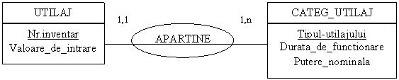 Dependentele functionale tranzitive existente intre atributele entitatii UTILAJE conduc la descompunerea entitatii in doua tipuri (UTILAJ si CATEG_UTILAJ) si la introducerea asocierii corespunzatoare dintre cele doua entitati, denumita APARTINE.