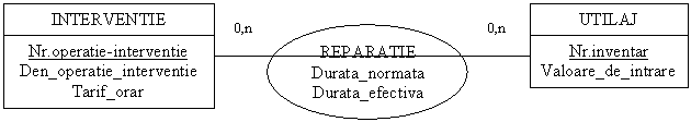 Existenta entitatilor INTERVENTIE si UTILAJ presupune o asociere denumita REPARATIE care are ca atribute proprii: "Durata_normata" si "Durata_efectiva"