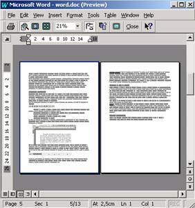 Aici am posibilitatea de a verifica asezarea pe pagina a documentului in ansamblu , inainte de tipari propriu zis. Cea ce se afiseaza depinde si de tipul de imprimanta ales din meniul Print. Exista posibilitatea de a controla numarul de pagini afisate, se pot mari zone din document. Se poate face o modificare de ansamblu pentru a schimba formatarile astfel, incat documentul sa incapa in intregime pe un numar de pagini selectat prin apasarea butonului Shrink to Fit. Revenirea in regim de editare se face prin apasarea butonului Close.