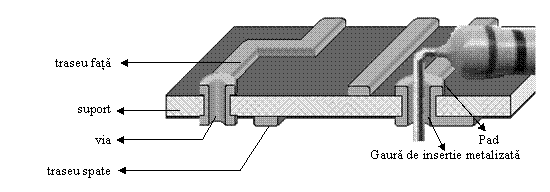 Gauri de trecere (via), pentru interconectarea pe verticala a componentelor. Aceste gauri, necesare doar pentru cablaje dublu si multi stratificate, sunt in mod obligatoriu metalizate si au de obieci un diametru mai mic decat cel al gaurilor de insertie.