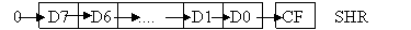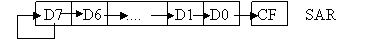 In figura de mai jos s-a reprezentat o deplasare logica si o deplasare aritmetica la dreapta. Se observa ca bitul care iese din operand este inscris in indicatorul de transport CF