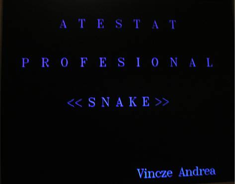 Programul incepe cu o interfata in care este scris "Atestat profesional", numele jocului si numele realizatorului programului. Desenarea interfetei de inceput am realizat-o intr-un subprogram separat. Urmeaza un meniu (al doilea subprogram) in care utilizatorul are 3 optiuni: prima optiune este inceperea unui joc nou, a doua este consultarea paginii de ajutor, iar ultima este optiunea de iesire din joc. Pentru realizarea meniului am folosit o structura repetitiva "while", iar conditia de oprire este apasarea tastei "Escape". La alegerea primei optiuni este lansat in executie jocul, iar la alegerea celei de-a doua se deschide o pagina in care sunt prezentate butoanele cu care se ghideaza sarpele si sunt explicate regulile jocului. La alegerea ultimei optiuni se va iesi din meniu. Inainte de iesirea din program apare pagina de sfarsit, care contine cuvantul "Fin". Pentru realizarea ei am folosit o alta functie, apoi programul se termina.