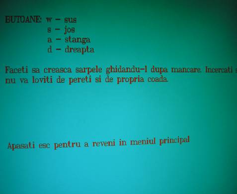 Am creat acest joc pentru a vedea cum se transpune in mod DOS o asfel de aplicatie. Nu am intalnit pana acuma nici o implementare a jocului in modul DOS. Am incercat sa realizez o varianta de "Snake" cat mai apropiata de cea de pe telefonul mobil, pentru a vedea diferenta de grafica si pentru a vedea daca pot crea o astfel de aplicatie intr-un mediu de programare utilizand cunostintele acumulate pana acum.
