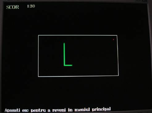 Scorul este afisat in coltul din dreapta de sus si este actualizat de fiecare data cand sarpele ajunge la mancare. Deasupra marginii de jos apare mesajul care informeaza utilizatorul despre tasta de iesire din joc.