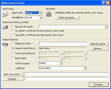 Optiunile de posta electronica din caseta de dialog Optiuni pentru mesaj sunt explicate in tabelul urmator. Aceste selectii se aplica mesajului pe care il creati in mod curent.