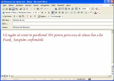 In acest exercitiu creati un mesaj nou, il marcati ca avand prioritate ridicata si il trimiteti partenerului de curs. Creati un alt mesaj, il marcati ca fiind Confidential si il trimiteti partenerului de curs.