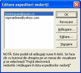 Este afisata caseta de dialog Editare expeditori nedoriti. Adresa de posta electronica a Vigor Airlines a fost adaugata in lista expeditorilor de mesaje nedorite.