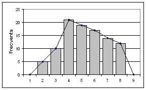 Prin unirea mijloacelor marginilor superioare ale fiecarui dreptunghi al histogramei reprezentative a unei serii de frecvente se obtine o linie franta, numita poligonul frecventelor seriei corespunzatoare, care indica cum variaza frecventa de-a lungul multimii valorilor seriei (Figura 8.8). Dupa construirea poligonului frecventelor, fiecare dintre colturile amputate sunt compensate cu triunghiuri adiacente, astfel incat suprafata inglobata in poligonul frecventelor ramane aceeasi (fiind echivalenta cu suprafata histogramei adica reprezinta efectivul seriei).