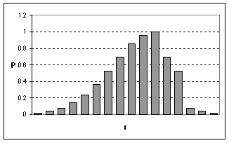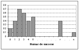 Se defineste evenimentul favorabil (succes), ca fiind extragerea unei bile negre; prin urmare, extragerea unei bile albe este un esec sau o non-realizare a evenimentului favorabil. Putem spune ca Pr reprezinta probabilitatea de a avea r succese din n experiente succesive. Termenii respectivi ai distributiei binomiale, vor reprezenta deci in ordine probabilitatile de a avea 0, 1, 2, 3, ., r, . succese din n experiente repetate (Figura 8.13).