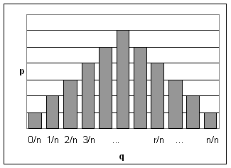 Aceasta distributie, dupa cum stim, este o distributie binomiala: distributia binomiala a procentajelor, ai carei termeni corespund dezvoltarii binomului (p + q)n . Esantionul cel mai probabil al acestei distributii are aceeasi proportie de bile albe (p) si de bile negre (q) ca si urna binara.