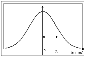 Daca facem referire la proprietatile distributiei normale, putem spune ca pentru esantioane diferite plecand de la o aceeasi populatie de origine, o diferenta d = (m1 - m2) superioara lui 2 Sd nu se va observa decat in putine situatii - cel mult 5 cazuri din 100 (Figura 8.56).