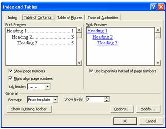 vom selecta numarul de nivele al cuprinsului, dupa care se apasa butonul Options. Va apare o noua fereastra de