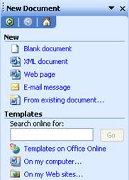 Exista posibilitatea de deschide un document nou nu din acest sablon "blank" ci pe diferite tipuri de destinatii (scrisori de afaceri, faxuri, pagini web etc.) care se pot apela prin accesarea zonei Create a new document