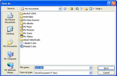 Pentru a salva un document se foloseste functia Save din meniul File. In fereastra care apare va trebui sa alegem trei elemente: locatia (Save in), numele fisierului (File name) si tipul fisierului (Save as type) dupa care sa validam prin butonul Save.