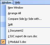 Lista de documente deschise se pot urmari apeland meniul Window. Daca aveti un document deschis puteti sa-i mai deschideti acestuia o fereastra (New Window). De asemenea, puteti realiza o comparatie intre doua fisiere prin Compare Side by Side with Tot pentru lucrul prin comparatie (de data aceasta pentru toate fisierele in lucru) se poate folosi Arrange All. Optiunea Split imparte ecranul in doua pentru un singur fisier.