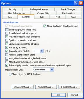 General - alegerea unitatii de masura in centimetri sau marirea numarului de fisiere (ultimele folosite) afisate (asa cum am mai spus initial sunt 4) User Information - alegerea numelui si, eventual, a unor date de identificare (e-mail) File Locations - schimbarea locului predefinit de salvare a documentelor Spelling & Grammar - deselectarea optiunilor de