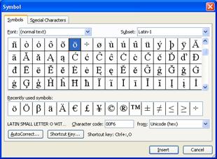 O serie de caractere nu se gasesc pe tastatura, de aceea, exista posibilitatea folosirii de simboluri (caractere grecesti, semne matematice, sageti etc.) prin meniul Insert - Symbol.