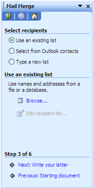 Pasul 3 Aveti de ales intre a lucra cu o lista existenta (Use an existing list), de a folosi contactele din Outlook sau de a scrie o noua lista (Type a new list). Daca alegeti prima optiune trebuie sa localizati si sa lansati in executie lista de nume si adrese (Browse). Vom alege prima optiune (crearea unei liste noi dupa un fiser Word care contine tabelul urmator - denumiti-l baza.doc).