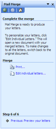 Pasul 6 Aceasta este ultima etapa din Expertul pentru imbinarea corespondentei! Optati pentru Imprimare. daca doriti sa imprimati scrisorile sau pentru Editare scrisori individuale. daca doriti sa va personalizati corespondenta. |