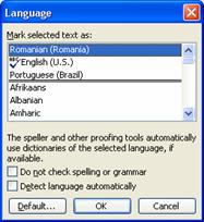 In ceea ce priveste corectura continutului textului trebuie sa ne raportam la limba in care este scris textul (romana, engleza, etc.). Setarea limbii in care se face corectura se face din meniu Tools - Language - Set Language |