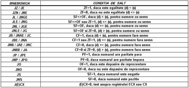 Instructiunile de salt conditionat sunt listate in tabela urmatoare: