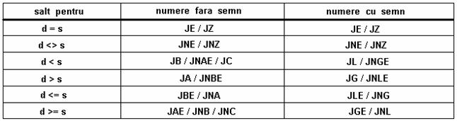 In compararea a doua numere, in scopul de a realiza saltul pentru o anumita conditie data, se vor folosi urmatoarele instructiuni:
