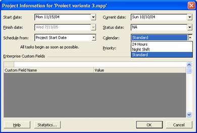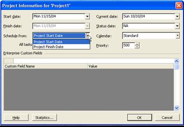 Modificarea modului de lucru se face cu ajutorul campului Project Þ Project Information. In figura 2.1, se poate vedea cum este posibila setarea desfasurarii proiectului intr-un sens sau in altul.