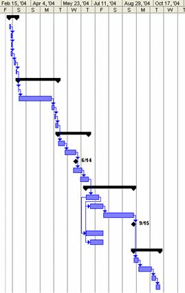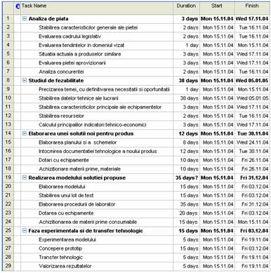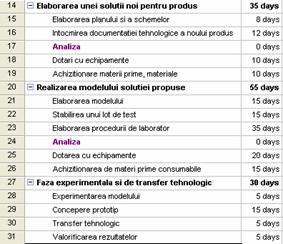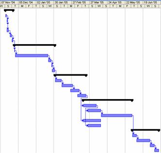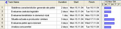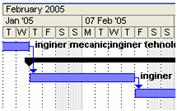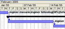 O mai clara imagine a raporturilor temporale intre activitati se poate obtine vizualizand diagrama Gantt. S-ar obtine o imagine de tipul celei din figura 2.9 (care reprezinta numai o parte din proiectul analizat).