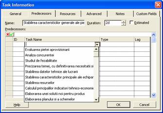 Se selecteaza o activitate si se face clic dreapta. Din meniu pop-up ce se deschide se alege campul Task Information. Se va deschide caseta de dialog omonima (vezi figura 2.6). Aici se activeaza sectiunea Predecessors. Un simplu clic pe o celula a coloanei Task Name va produce o lista derulabila din care se poate selecta numele activitatii precedente. Un clic pe coloana Type va deschide o alta lista derulabila cu ajutorul careia se va alege tipul de dependenta.