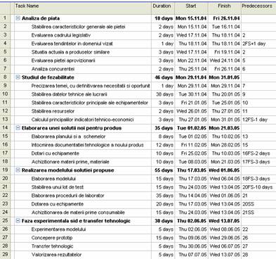 Se "elibereaza" coloana Predecessors (imediat in dreapta coloanei Finish). Acest lucru se face prin "tragerea" marginii din dreapta a panoului ce contine diagrama Gantt (vezi figura 2.5). Acest lucru nu este strict obligatoriu, dar este indicat pentru ca va permite vizualizarea tuturor setarilor.