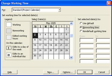 Pentru aceasta se va utiliza campul Tools Þ Change Working Time. In caseta de dialog omonima (vezi figura 2.14) se cauta luna decembrie, ziua 30 si se "bifeaza" butonul radio Nonworking time. La fel se va proceda pentru zilele de 31 decembrie si respectiv 2 mai 2005.