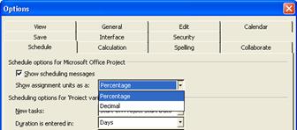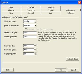 Apasarea butonului Options, permite stabilirea de noi setari globale relative la proprietatile calendarului de lucru folosit (vezi figura 2.16): ziua in care incepe saptamana de lucru (Week starts on:), ziua de debut a anului fiscal (Fiscal year starts in:), ora de incepere a programului (Default start time:), ora de sfarsit a programului (Default end time:), numar de ore de lucru pe zi (Hours per day:), numar de ore de lucru pe saptamana (Hours per week:) si numarul de zile lucratoare pe luna (Days per month:). In figura 2.16, s-a optat pentru saptamana ce incepe lunea (si nu duminica, asa cum se considera implicit). Tot acum s-a setat ca implicit si programul zilnic care incepe la ora 8 dimineata si se termina la ora 16 (deci fara pauza de masa).