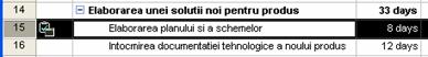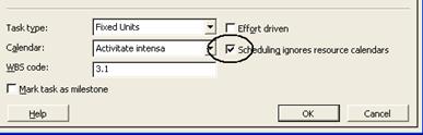 Se mai constata ca desi durata activitatii a ramas aceeasi (8 zile lucratoare), data de finalizare s‑a modificat (vezi figura 2.31.b ; in figura 2.31.a apare activitatea inaintea alocarii calendarului nou definit) pentru ca se va lucra si in week-end-uri.