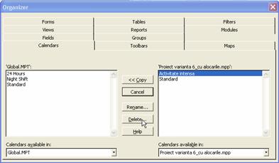Daca se doreste stergerea sau redenumirea unui calendar deja definit, se va utiliza campul Tools Þ Organizer. Se va ajunge la caseta de dialog din figura 2.32). Dupa selectia numelui calendarului care se doreste a fi sters, se apasa butonul Delete