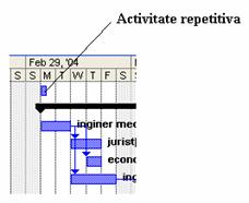 In animatie a fost definita o activitate denumita Sedinta lunara de analiza, ce are loc in prima zi de luni a fiecarei luni si dureaza 1,5 ore. Dupa cum se poate observa si pe diagrama Gantt, activitatile recurente (repetitive) sunt figurate pe o orizontala separata (figura 2.33).