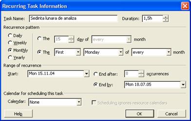 Numarul de aparitii pentru fiecare activitate recurenta se stabileste tot din caseta de dialog Recurring Task Information (figura 2.34). Astfel, o activitate poate avea loc de un numar fix de ori (End after.occurrences), sau se poate incheia inaintea unei date stabilite (End by.). Data de la care vor incepe sa aiba loc activitatile recurente se stabileste si ea (Start.