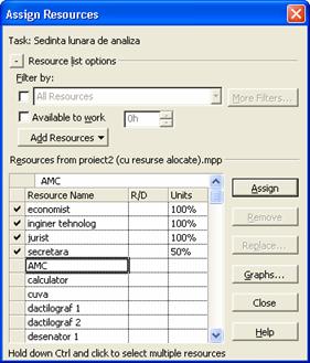 Pentru activitatile recurente definite se vor aloca si resurse (dupa procedura clasica), asa cum se poate vedea in figura 2.35. Alocarea se va face activitatii centralizatoare Sedinta lunara de analiza.