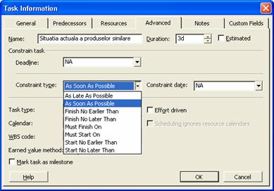 Se observa ca intr-o prima etapa se defineste tipul de restrictie (cu ajutorul casetei Task Information), iar intr-o a doua [etapa] se precizeaza data mai devreme de care nu poate demara activitatea.